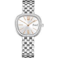 Sixtie watch, 29 mm. Case in steel set with 51 brilliant-cut diamonds (approx. 0.52 ct). White solar satin-brushed dial. Bracelet in steel. Piaget 57P quartz movement.