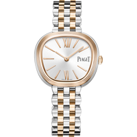 Sixtie watch, 29 mm. Case in 18K rose gold. White solar satin-brushed dial. Bracelet in steel and 18K rose gold. Piaget 57P quartz movement.