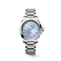 This new Conquest is driven by an exclusive Longines self-winding mechanical movement. Presented in a 34 mm steel case water-resistant up to 10 bar (100 m), it features a snailed pastel-blue sunray dial with rhodium-plated hands and applied rhodium-plated hour markers with Super-LumiNova® treatment.