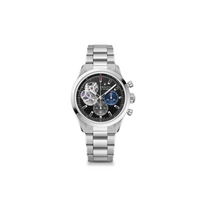 | The CHRONOMASTER Open offers a view of the beating heart of the El Primero movement from the dial. Crafted in a sleek 39.5mm steel case, this version features a matte black dial with tricolour counters and a transparent counter for the running seconds, paired with an integrated steel bracelet. Powered by the El Primero 3604 1/10th of a second automatic chronograph movement. |