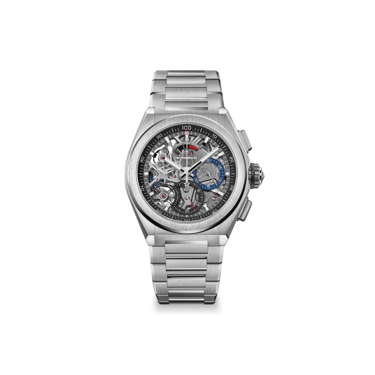 | The high-frequency El Primero 21 1/100th chronograph in a 44mm titanium DEFY case, paired with a titanium bracelet. Its automatic movement features two independent high-frequency escapements beating at 50Hz for the chronograph function and 5Hz for timekeeping. |