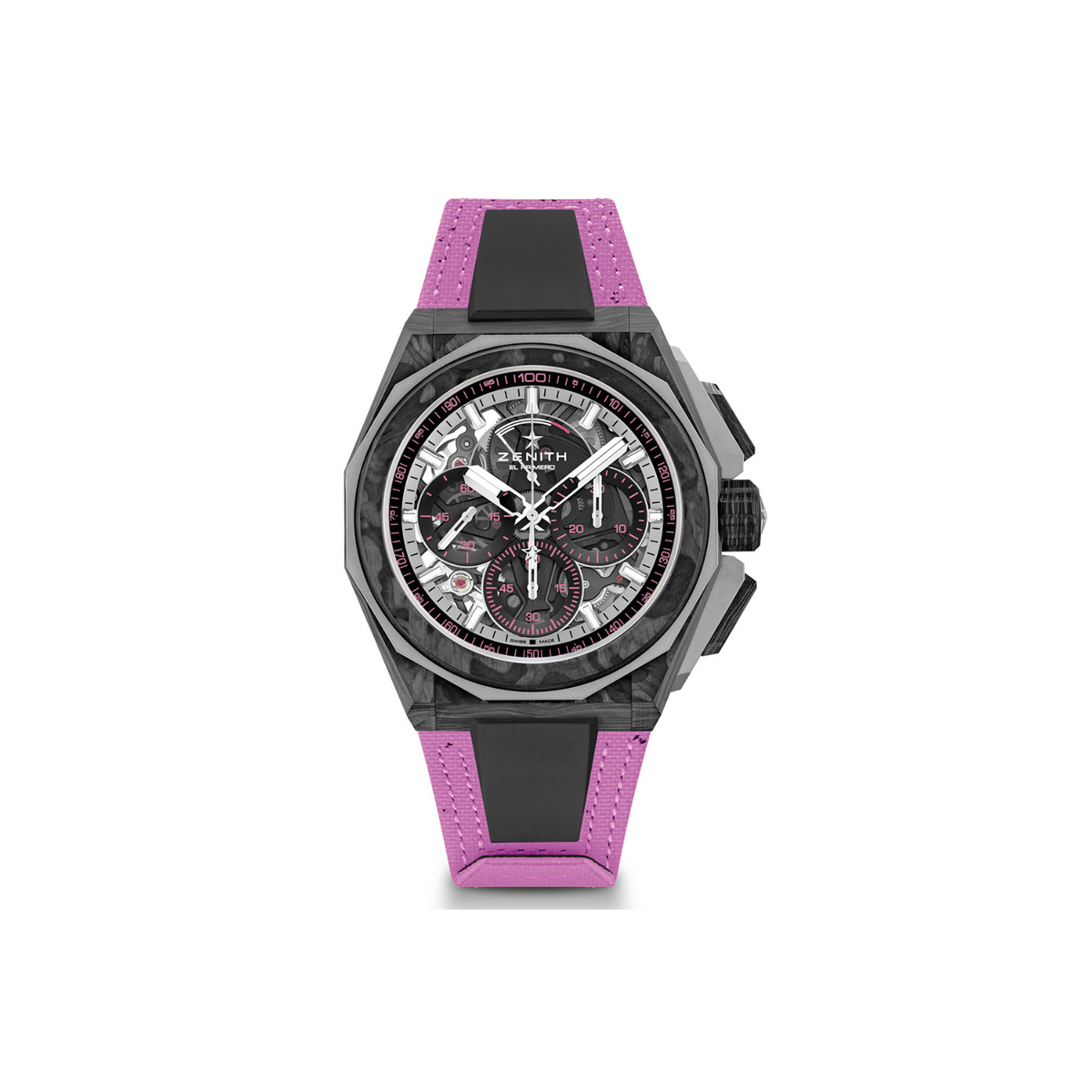 The DEFY Extreme E Energy X Prix limited edition 1/100th of a second chronograph inspired by the Extreme E electric rally race in Punta del Este, Uruguay. Crafted in a robust carbon fiber case with titanium elements. Powered by the El Primero 21 1/100th of a second automatic high-frequency chronograph calibre. Purple recycled tires Velcro strap.