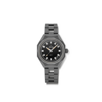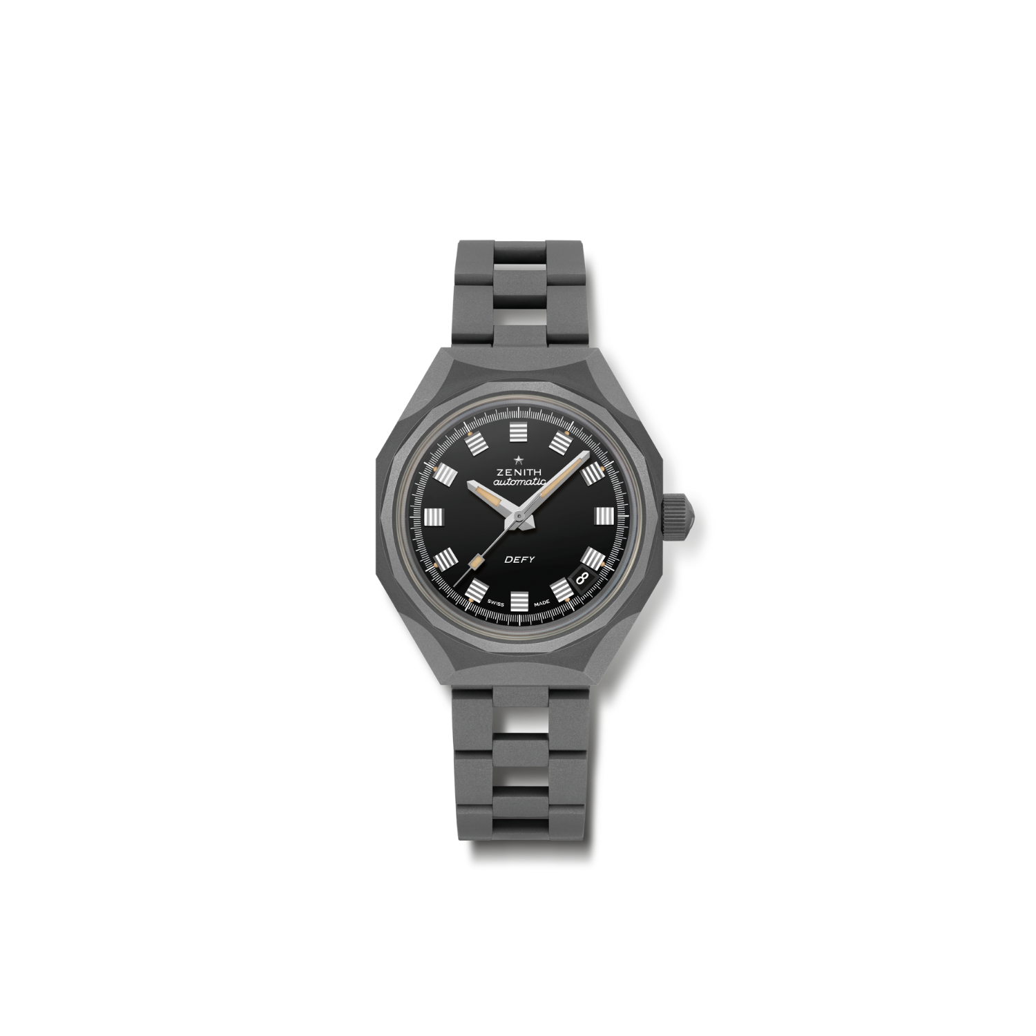 | A modern reinterpretation of the first DEFY wristwatch model from 1969. Crafted in a robust octagonal matte finished titanium case with 14-sided bezel and paired with a titanium ladder bracelet. The matte black dial adds a distinctly vintage touch. Powered by the ELITE 670 automatic manufacture movement. |