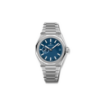 DEFY Skyline in a 41mm steel octagonal case with a faceted bezel, featuring a blue-toned sunburst-patterned dial revisiting the emblematic ZENITH four-pointed star. Powered by the El Primero 3620 high-frequency automatic manufacture movement with the very first 1/10th of a second indicator. Interchangeable steel bracelet and blue patterned rubber strap.