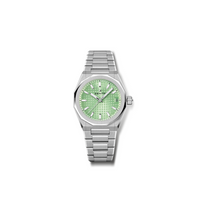DEFY Skyline in a 36mm steel octagonal case with a faceted bezel, featuring a metallic pastel green sunburst-patterned dial revisiting the emblematic ZENITH four-pointed star. Powered by the Elite 670 automatic manufacture movement. Interchangeable steel bracelet and green patterned rubber strap.