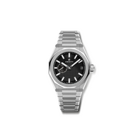 | DEFY Skyline in a 41mm steel octagonal case with a faceted bezel, featuring a black-toned sunburst-patterned dial revisiting the emblematic ZENITH four-pointed star. Powered by the El Primero 3620 high-frequency automatic manufacture movement with the very first 1/10th of a second indicator. Interchangeable steel bracelet and black patterned rubber strap. |