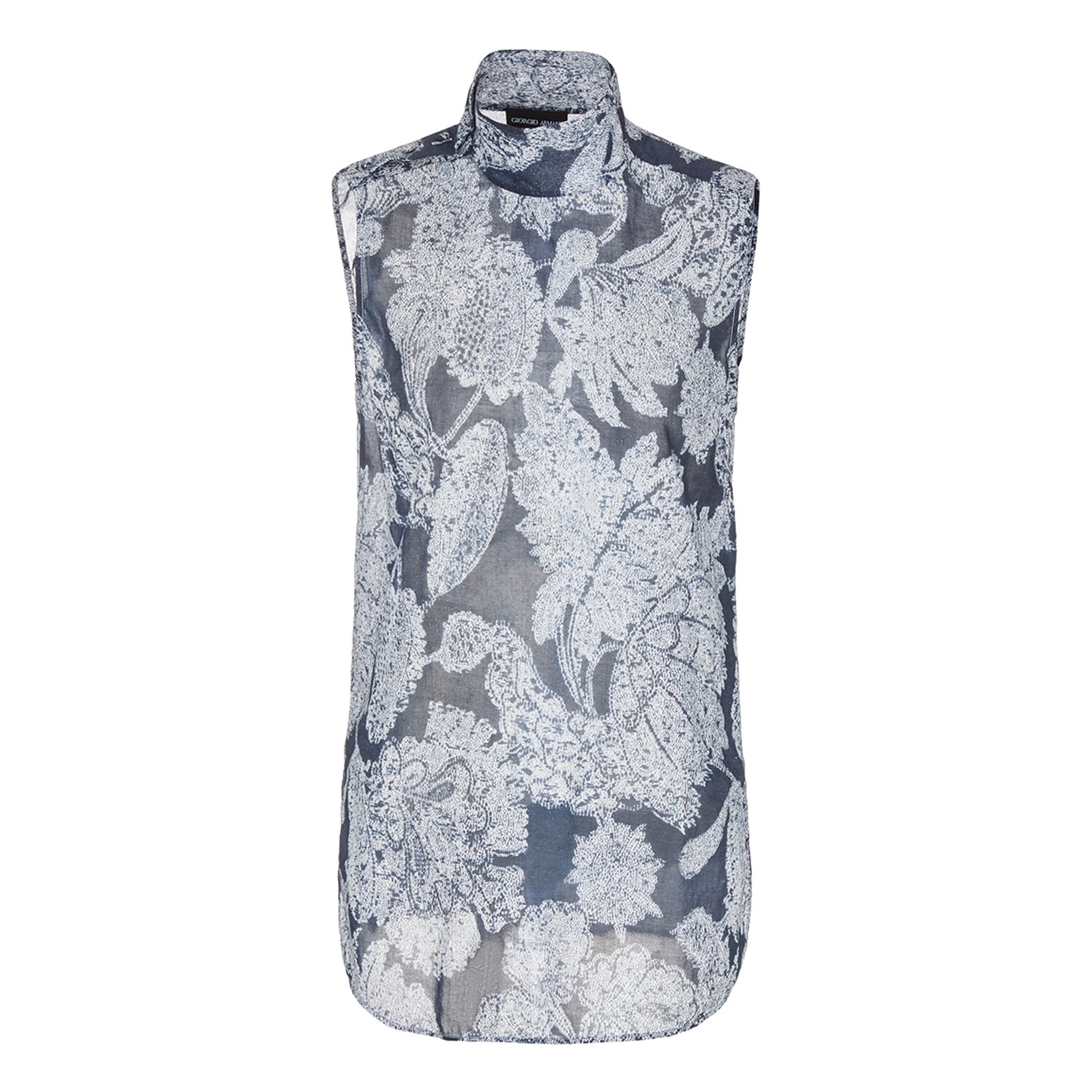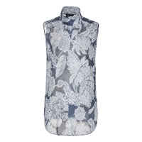 Feminine, subtle sleeveless shirt, made of faded printed linen in a floral motif, a recurring theme of the denim collection. The style has a stand collar with a shoulder fastening and two side slits that add movement. A piece with a fresh spirit, perfect for teaming with the other denim collection creations for a striking total look.