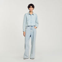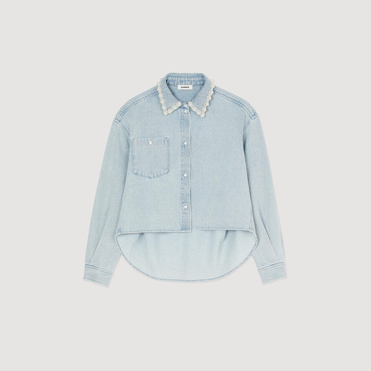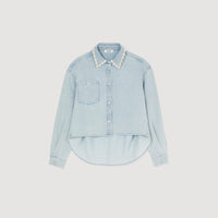 Cropped denim shirt with beaded collar, long sleeves, button placket and chest pocket.