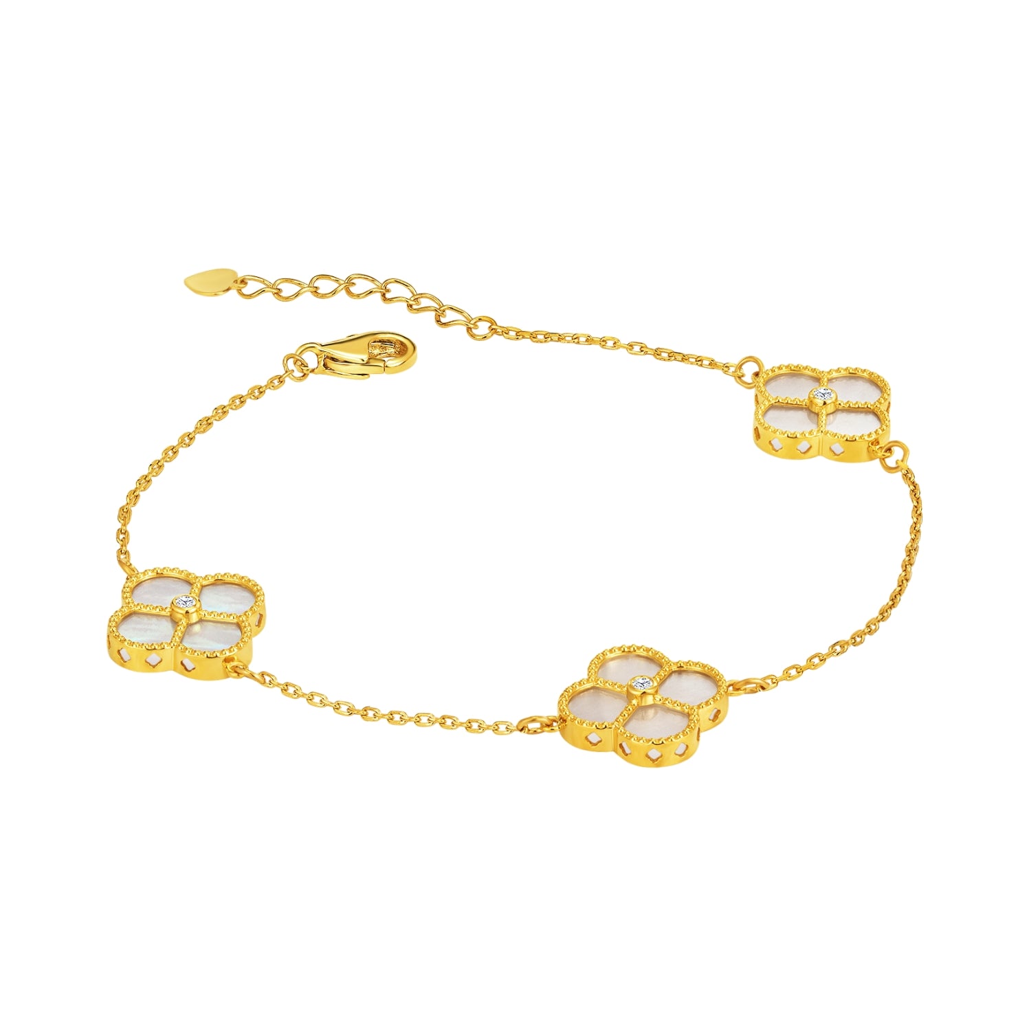 Celebrate timeless elegance with this stunning bracelet, crafted from 916 yellow gold and accented with rich red agate gemstones. Each intricate charm features a delicate quatrefoil design, enhanced by a sparkling center stone that adds a subtle touch of brilliance. The vibrant red hue of the agate beautifully complements the golden glow, symbolizing passion, strength, and prosperity
