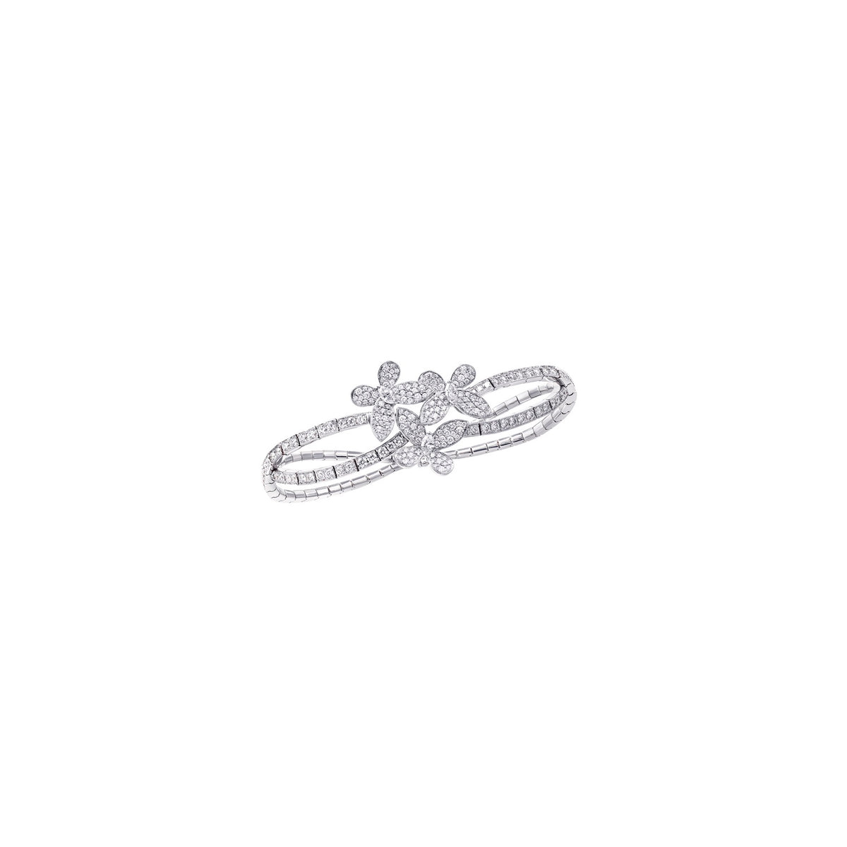 Two entwined rows of round diamonds encircle the wrist in our captivating Triple Pavé Butterfly bracelet in white gold. Expertly articulated by our master craftspeople to move with exceptional fluidity, a trio of pavé diamond butterflies have been woven into the design, with their delicate bodies depicted in marquise diamonds.