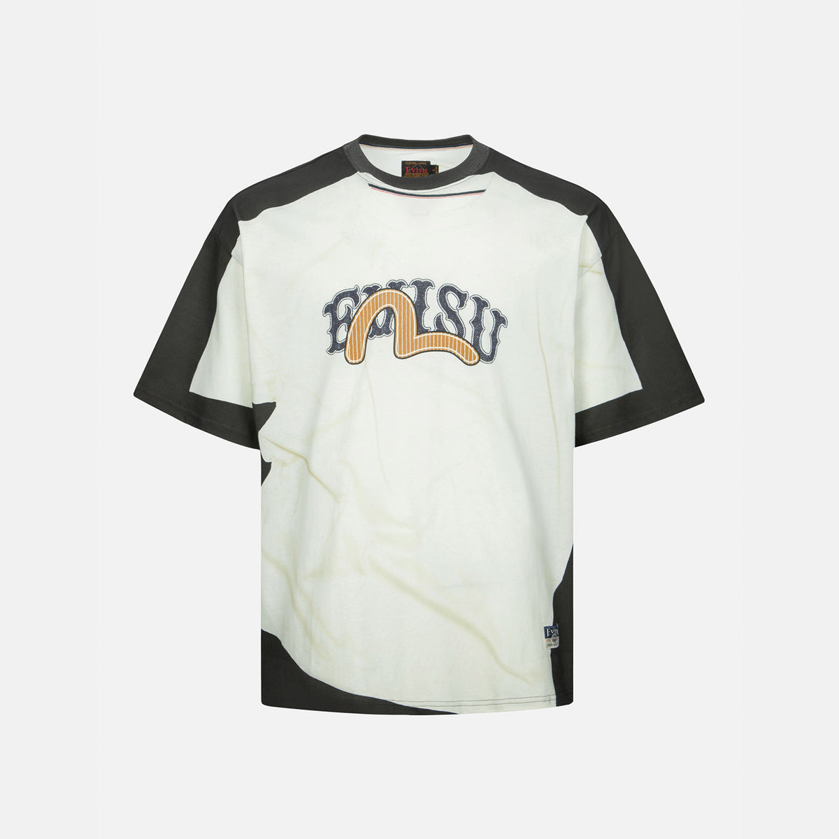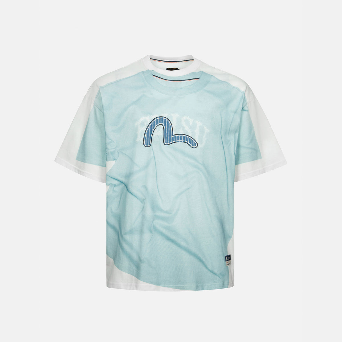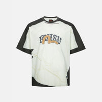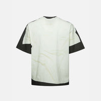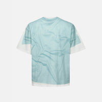 We are delighted to present this playful T-shirt, which utilizes print techniques to create an ingenious "layered" design. The printed graphic on the top garment appears to be casually placed atop another T-shirt, while also featuring the brand's logo and a seagull motif in distinct textures, skillfully blending the brand's identity with a unique visual effect.