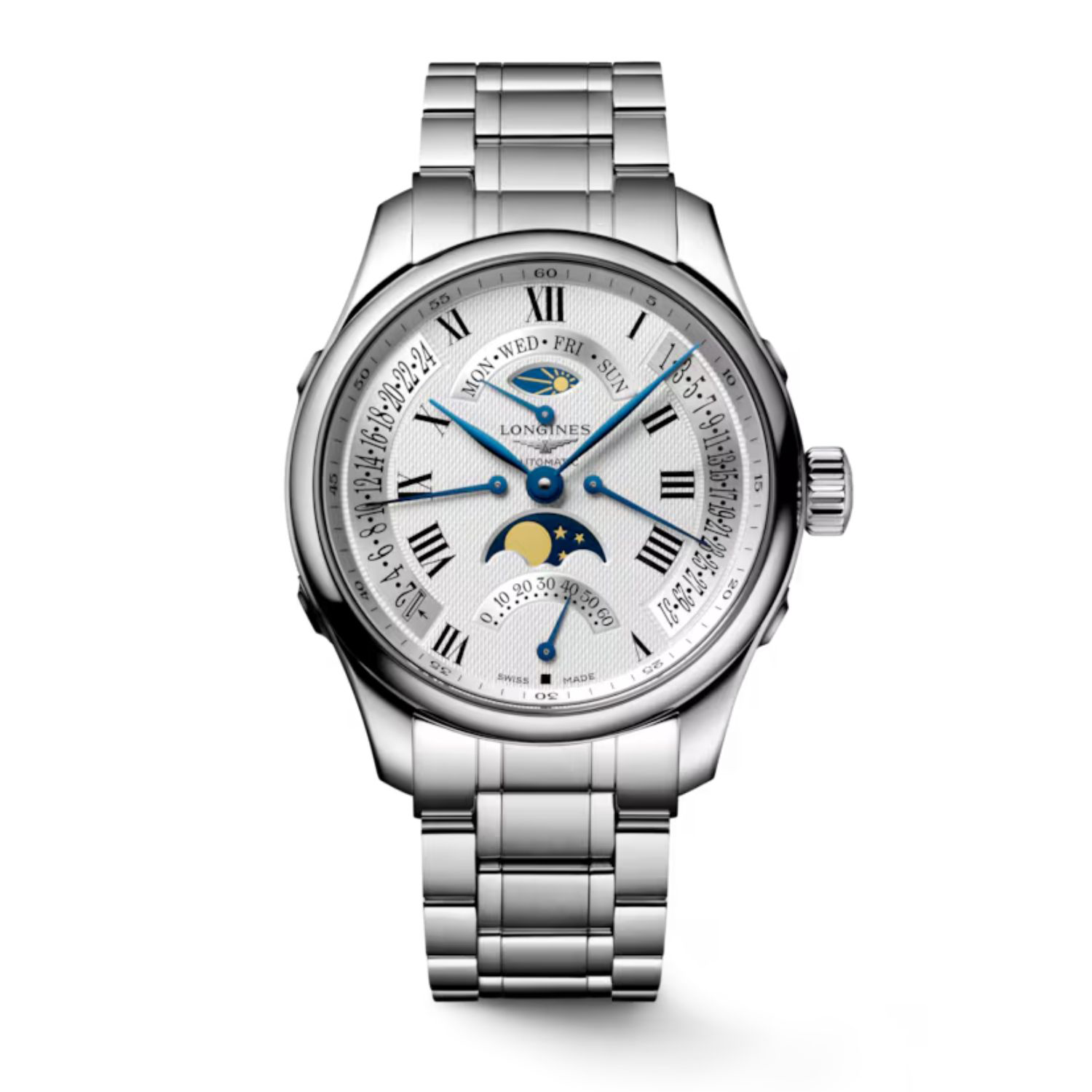 Explore the L2.739.4.71.6 Silver "barleycorn" watch from the Longines Master Collection Retrograde collection and be charmed by its Stainless steel strap.