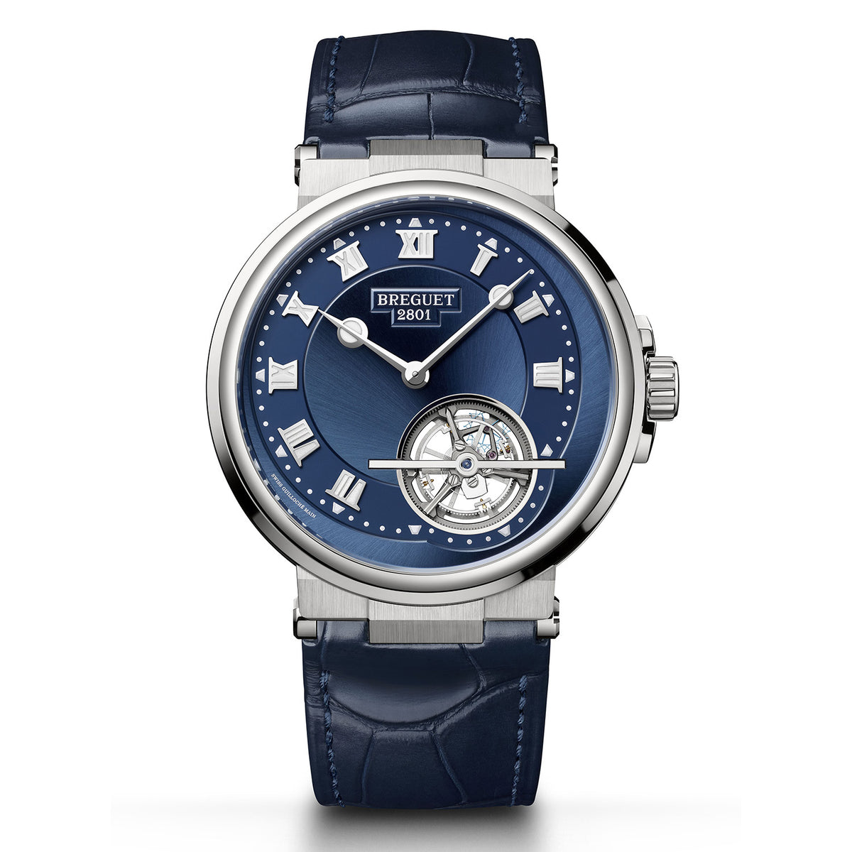 Marine wristwatch with tourbillon. Extra-thin self-winding movement with peripheral oscillating weight. Off-centred chapter ring with luminescent gold hands and hour-markers. Small seconds on the tourbillon shaft.
