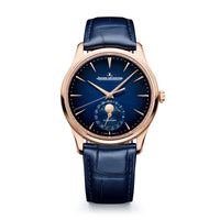 The new Master Ultra Thin Moon boasts a sunray dial in a deep, intense, slightly smoky blue. With a design that is as complex as it is meticulous, this gradient midnight blue echoes the deep blue alligator leather strap. This chromatic statement divinely contrasts the pink gold polished case with profiled lugs, the applied indexes, the Dauphine hands and the minute track. A window at 6 o'clock displays the moon phase — an emblematic complication of the Master Ultra Thin collection — which finds its home amidst the bewitching background of blue shades. The aesthetic balance is remarkable. Entirely created, decorated and assembled within the Manufacture, the self-winding Jaeger-LeCoultre Calibre 925 promises 70 hours of power reserve.