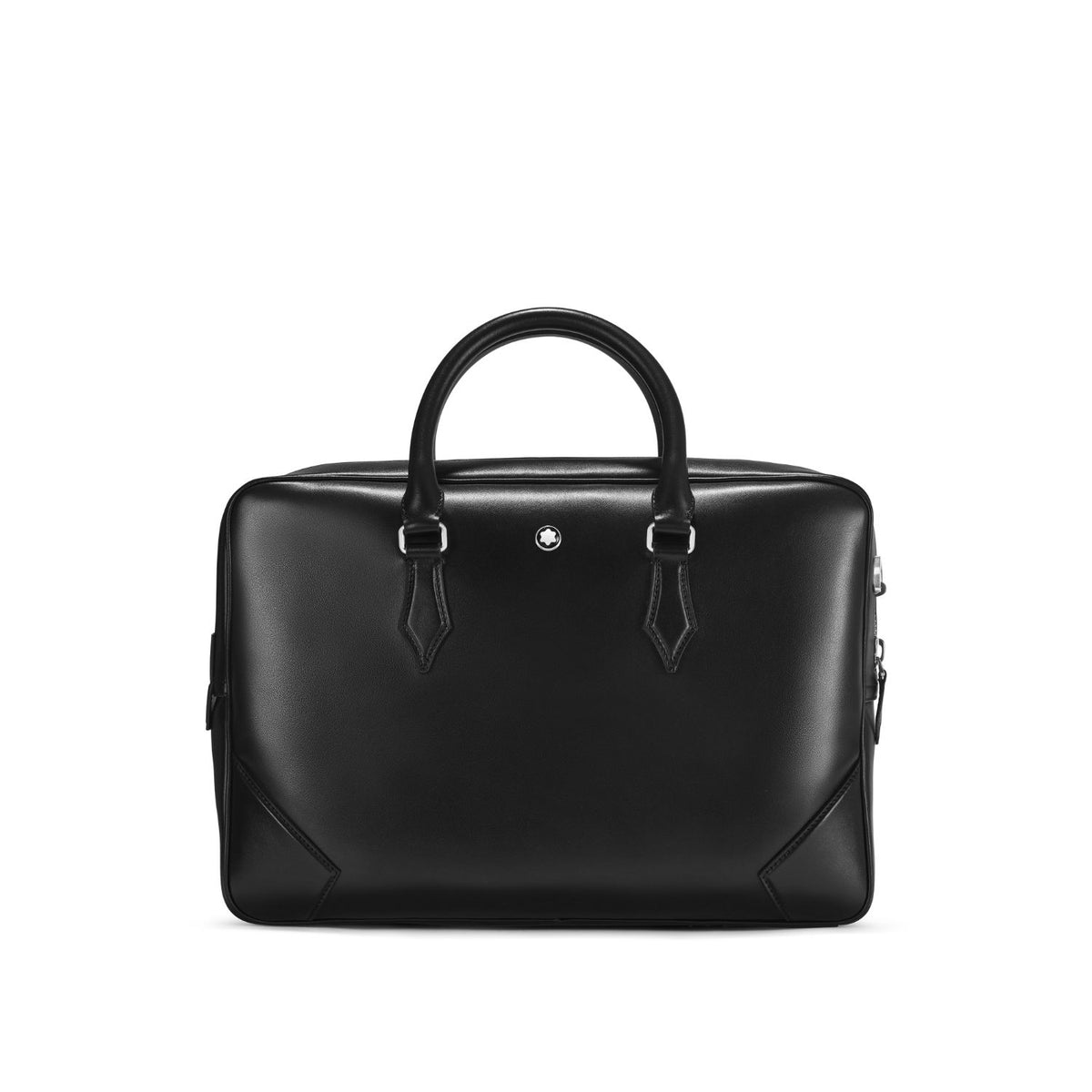 Inspired by the writing culture, the Meisterstück Document Case is an elegant companion for business trips. Crafted from a new deep shine black leather, all its details speak the language of the nib: stitching, zip pullers, handles recall the shape of the nib, the essence of Montblanc. The leather top handles, the removable leather shoulder strap ad the satellite system offer multiple carrying options, while inside pockets ensure practicality.