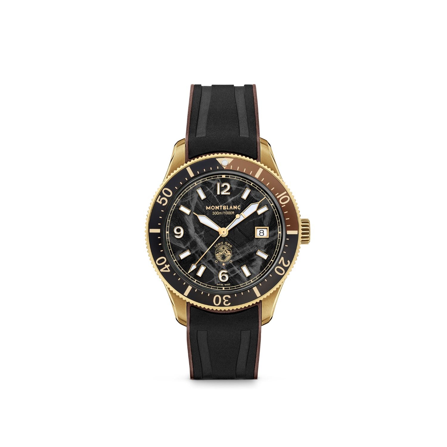 Capturing the colour of the setting sun over the glacier, this Montblanc Iced Sea Automatic Date combines a black glacier pattern dial with a warm bronze case. The glacier pattern dial is inspired by the Mer de Glace - Sea of Ice - the main glacier of the Mont-Blanc Massif. Its texture was achieved using an almost-forgotten ancestral technique called gratté-boisé. This bronze edition comes with a bi-colour unidirectional anodized aluminum bezel, a 3D engraving on the bronze-coated titanium case back, and an interchangeable black rubber strap with brown outline and fine adjustment system.