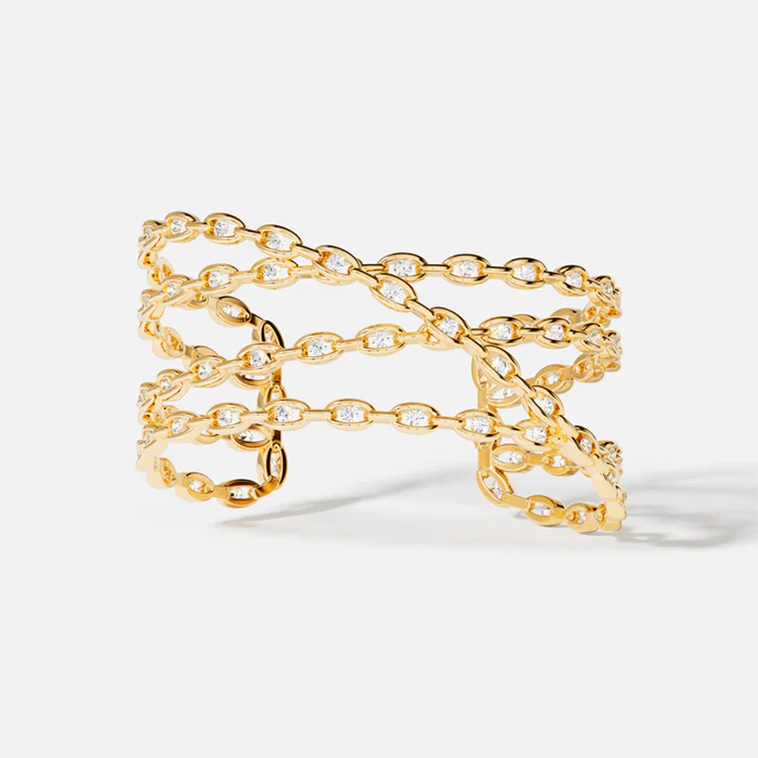 This bangle made with APM Alloy and 18k yellow gold plated is microset with white cubic zirconia. The setting technique gives the stones a refined floating effect.