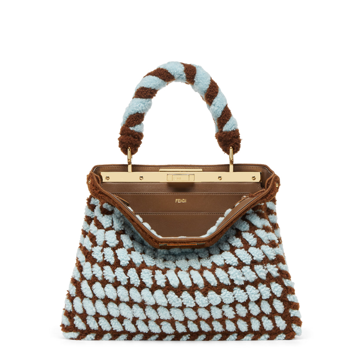 Medium Peekaboo ISeeU bag made of soft, brown and light blue sheepskin meticulously braided by hand. Decorated with the iconic twist lock on both sides.
