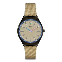 This ultra-slim stainless steel watch with gray PVD coating sports a beige dial with white and pink print and glow-in-the-dark indexes with innovative 3D details. The beige textile strap features a stainless steel buckle with gray PVD and a beige textile loop.