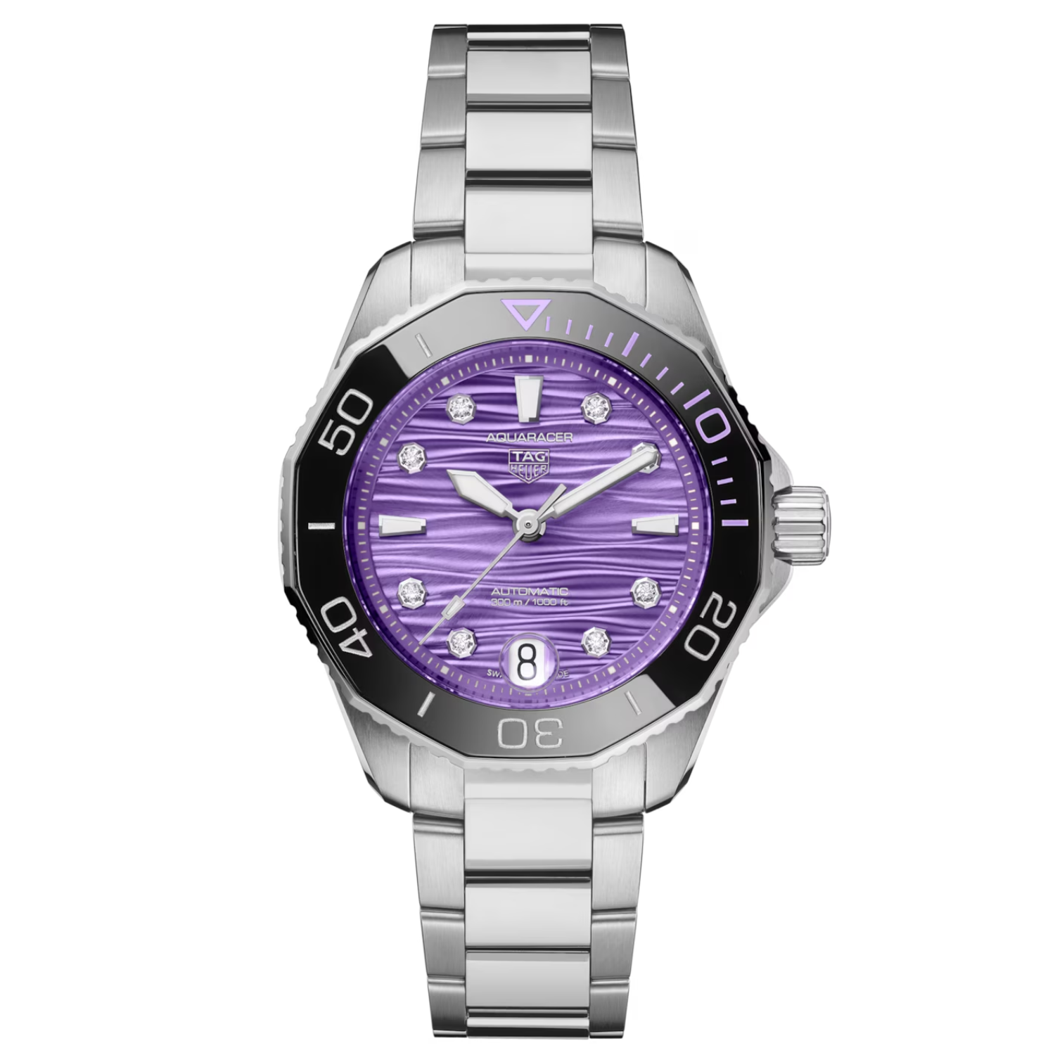 The TAG Heuer Aquaracer Professional 300 Date is inspired by the vivid colors of coral reefs found in the depths of the ocean. With its striking purple dial and diamond accents, this dive watch fuses elegance with rugged functionality, designed to thrive in the depths and dazzle onshore.