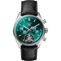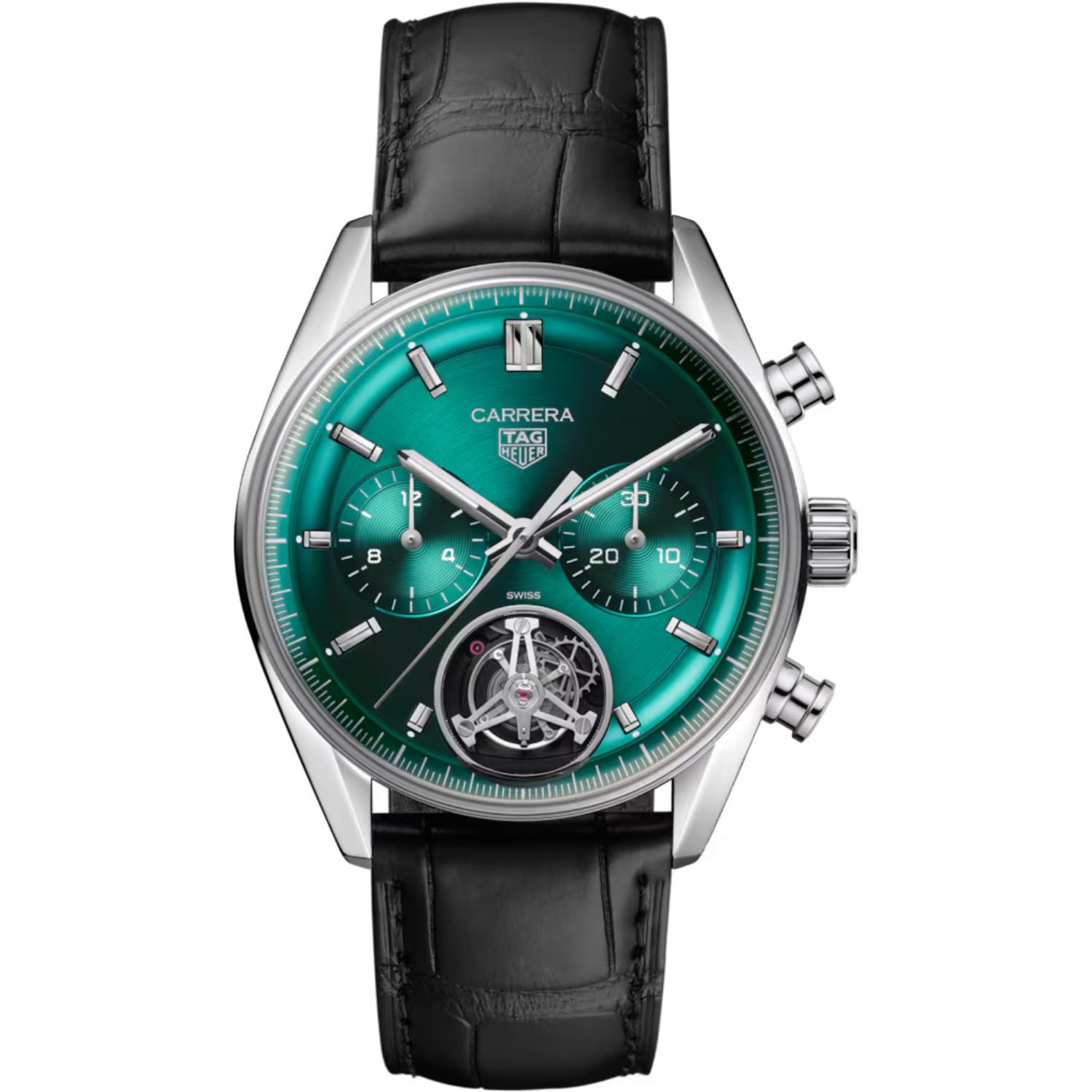 Introducing the TAG Heuer Tourbillon Chronograph in a stunning 42 mm design. The striking monochromatic teal green dial encapsulates the very essence of precision timekeeping. Paired with a black alligator leather strap, it’s set to speed ahead in style.
