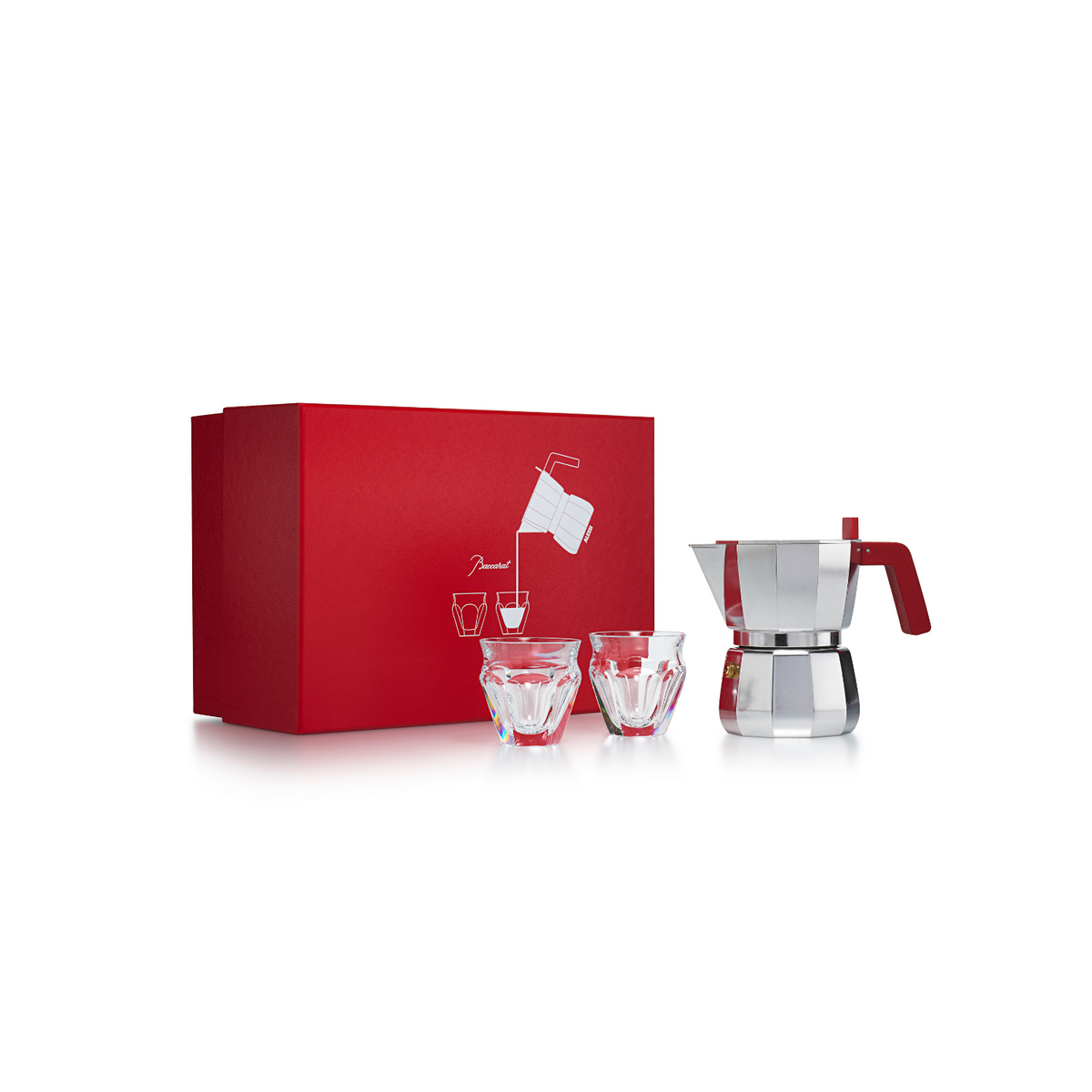 A natural collaboration between renowned Maisons, Baccarat and Alessi have united two iconic designs for the ultimate coffee experience. The set includes a pair of Talleyrand glasses with a 9cl capacity alongside the 2019 edition of the moka, designed by David Chipperfield, reinterpreting the original codes of the piece, with its geometric construction, brushed metal finish and flat sides to beautifully accompany the glasses. This exclusive edition of the coffee maker presents a red handle and custom engraving on the lid.