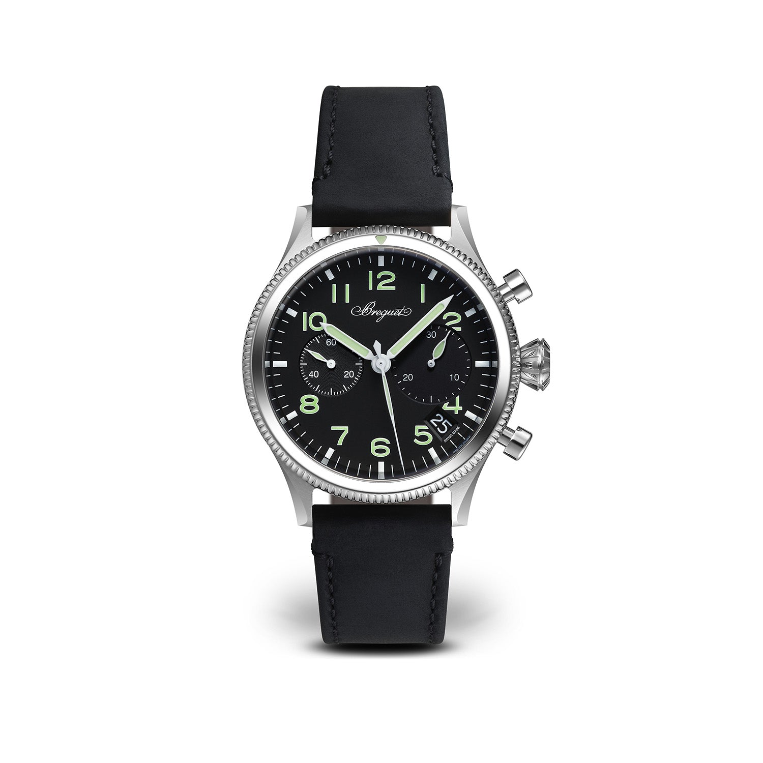 Type 20 flyback chronograph in steel. Self-winding movement with date and subdial for the seconds. Balance spring in silicon. 30-minute counter. Bidirectional rotating bezel.