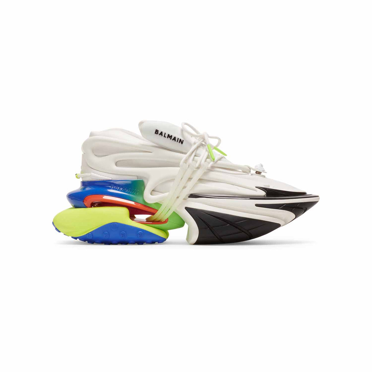 Multi-material design in leather and neoprene Lace fastening 1 signature Lion snap on the front in lacquered metal Contrasting Balmain logo on the tongue and embossed logo on the side and heel Balmain branded lace detail at heel Hollow sole with air-cushion effect, B studs Smooth leather insole Sole height: 7 cm Upper height: 6 cm Material: calfskin, neoprene
