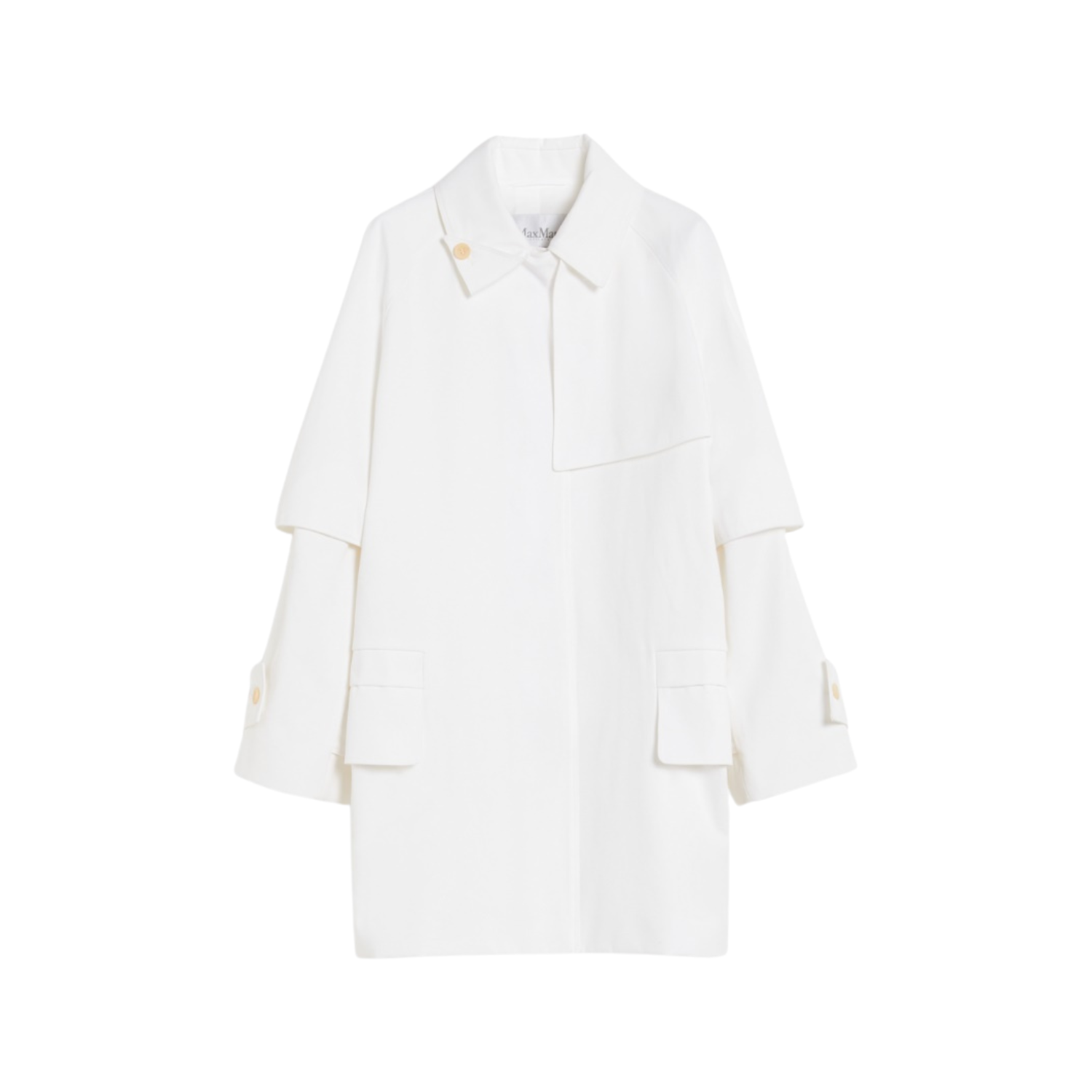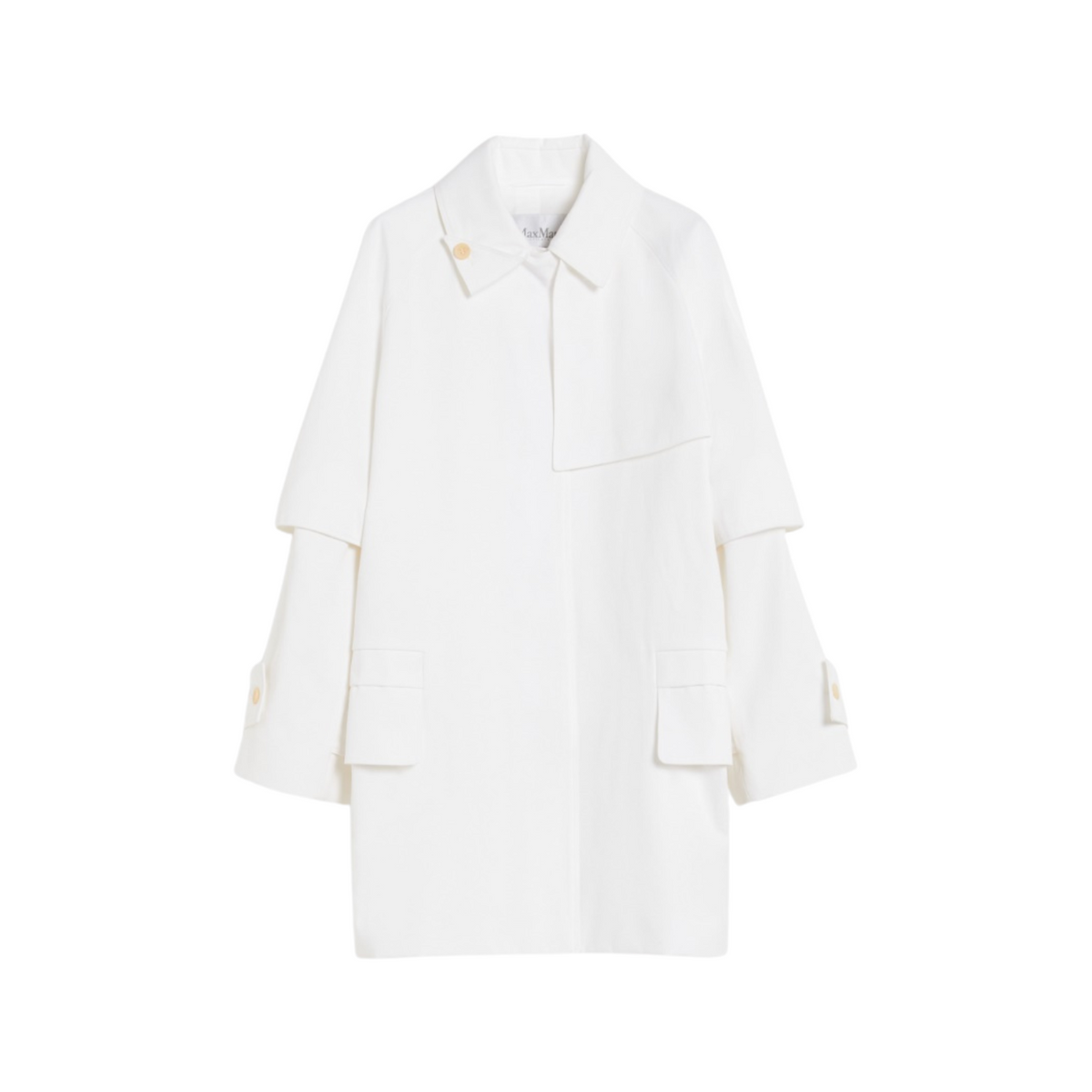 Short, single-breasted trench coat in heavy, water-repellent pure cotton gabardine. Lined garment featuring a straight silhouette with iconic details: asymmetrical bib on the front, long raglan sleeves with cuff straps and a seam motif at the elbow. Featuring a folded shirt collar secured with a decorative button on the left side and flap pockets at the front. The matching belt allows you to accentuate the waist. Concealed button fastening at the front.