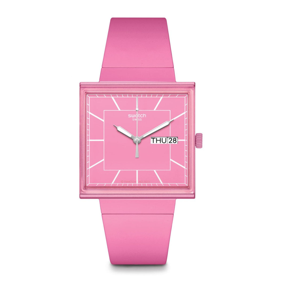 The square BIOCERAMIC rose watch case features edge-to-edge biosourced glass that gives a side view of the watch's printed white indexes. The square dial has silver-colored glow-in-the-dark hands and a day-date window at 3 o'clock. The dial is complemented by an integrated biosourced strap with a BIOCERAMIC buckle. A printed battery cover on the back depicts a front view of the watch.